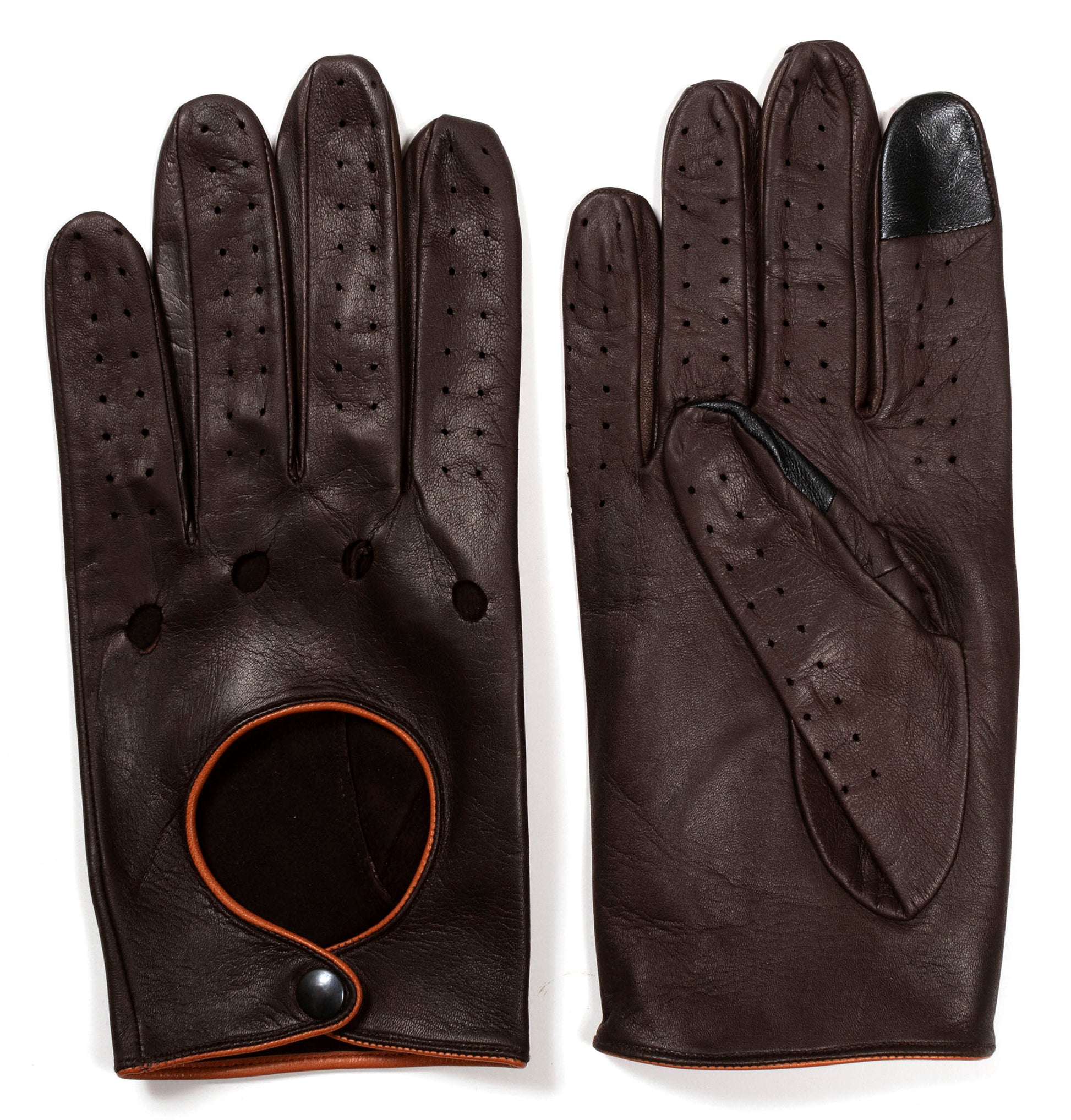 Perforated leather driving gloves with touch screen compatible index fingers and thumbs. Domed wrist closure.